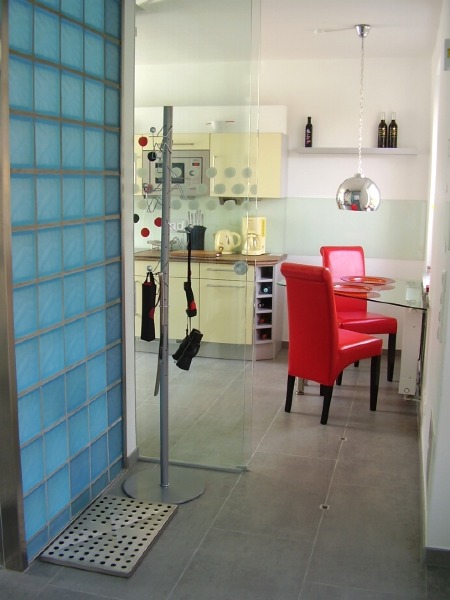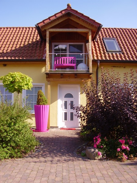 Eingang mit eigenem Balkon im Obergeschoß und eigener Terrasse vor dem Haus.