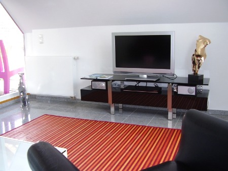 Design Wohnzimmer mit Flachbildschirm-Fernseher, DVD, CD und Radio. Sofa und Sessel sowie Glastisch sorgen für erholsame Entspannung.